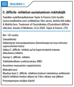 Uusiutumisen riskitekijät on esitetty taulukossa «»1 (14-15,17-23). C. difficile -bakteerit esiintyvät kahdessa muodossa: vegetatiivisessa ja itiömuodossa, joista jälkimmäinen selviää myös mahalaukun happamassa ympäristössä. Protonipumpun estäjien (PPI) käyttö altistaa infektiolle ja sen uusiutumiselle (24), minkä vuoksi on tärkeää tarkistaa, onko PPI-lääkkeelle todellista tarvetta. PPI-lääkitys näyttää noin kaksinkertaistavan riskin, mutta tutkimuksissa potilaiden absoluuttiset määrät jäivät kuitenkin pieniksi (25-26).