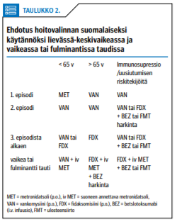Eurooppalaisessa hoitosuosituksessa vuodelta 2013 (European Society of Clinical Microbiology and Infectious Diseases - ESCMID-CPG) kuitenkin suositellaan lievään tautiin metronidatsolia ja vakavaan tautiin vankomysiiniä - kuitenkaan metronidatsolia ei tule käyttää, mikäli uusiutumisriski on suurentunut (8-9). Riskiksi mainitaan yli 65 vuoden ikä, muuhun syyhyn otettava antibioottilääkitys, vaikea perussairaus ja/tai munuaisten vajaatoiminta, PPI-lääkitys sekä aiemmin sairastettu C. difficile -infektio. Näin ollen hoitovalinta on melko monimutkainen, eikä lopullinen valinta aina ole yksiselitteisesti suosituksen mukainen.
