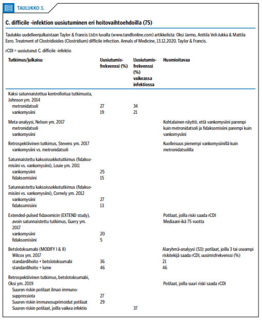 Tutkimustuloksia C. difficile -infektion uusiutumisesta eri hoitovaihtoehdoilla on esitetty taulukossa «»3.