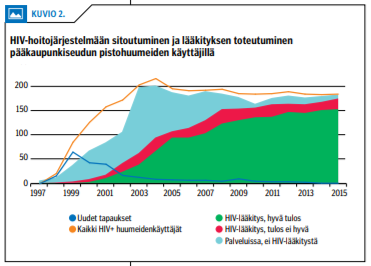 Suomessakin on todettu onnistuneen hoitoon-ohjauksen merkitys. Pääkaupunkiseudulla havaittiin HIV-epidemia pistohuumeiden käyttäjien keskuudessa vuonna 1998. Epidemia havaittiin varsin alkuvaiheessa (21,22). Joulukuussa 2000 perustettiin HIV-positiivisille pistohuumeiden käyttäjille palvelukeskus, jonka palvelut räätälöitiin vaikeasti syrjäytyneelle kohderyhmälle (23). Huumeidenkäyttäjät saatiin hoidon piiriin vasta heille suunnatun palvelukeskuksen perustamisen jälkeen (kuviot «»1 ja «»2), ja samanaikaisesti pistohuumeiden käyttäjien uusien HIV-tapausten ilmaantuvuus kääntyi laskuun. Hoitojärjestelmään kiinnittyneitä oli 53 % (67/126) palvelukeskuksen avautuessa vuonna 2000 ja yli 99 % (183/184) vuonna 2016 (24).