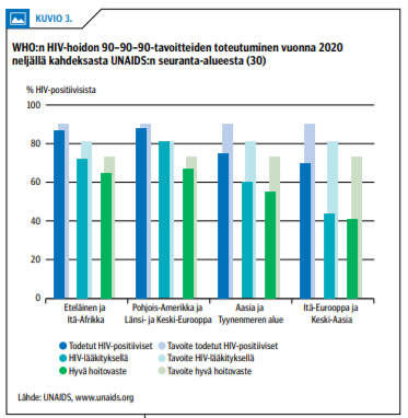 WHO:n tavoitteena on siis, että HIV-lääkitystä saavista potilaista yli 90 %:lla on hyvä hoitotulos käyttäen kriteerinä mittauskynnyksen alapuolella olevaa viruspitoisuutta (12).