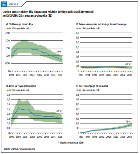 Kattava lääkityksen toteuttaminen johtaa uusien HIV-tapausten vähenemiseen, mikä havaittiin ensimmäiseksi San Franciscossa ja Brittiläisessä Kolumbiassa kymmenisen vuotta sitten (28,29). Vuosituhannen vaihteesta alkaneen kehitystyön ansiosta HIV-lääkityksen saatavuus ja teho ovat nykyään eteläisessä ja Itä-Afrikassa yhtä hyvät kuin kehittyneissä länsimaissa (kuvio «»3) (30). Samanaikaisesti uusien HIV-tapausten määrä on laskenut voimakkaasti etenkin näissä osissa Afrikkaa (31) (kuvio «»4).