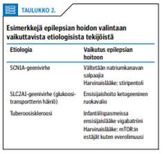 Epilepsioiden taustalla on moninaisia etiologisia tekijöitä. Niiden selvittäminen on tärkeää, koska etiologia voi suoraan ohjata hoidon valintaa (taulukko «»2). Etiologian tunteminen auttaa myös ennakoimaan mahdollisia liitännäisongelmia ja ennustetta. Nykytutkimuksilla epilepsian etiologia jää kuitenkin edelleen avoimeksi noin joka kolmannella lapsella (3).