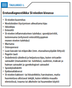 Kudosalkuperältään SI-nivelperäinen, spesifeihin sairauksiin tai vammoihin liittymätön kipu ei ole välttämättä kliinisesti erotettavissa muusta epäspesifistä alaselkäkivusta (6). Erotusdiagnostiikassa on huomioitava lantion alueelta, lonkkanivelistä, alaselästä ja sisäelimistä heijastuva kipu (taulukko «»1). Lannerankaperäinen heijastekipu on tavallisin pakara-alueella tuntuvan selkäkivun syy (8).