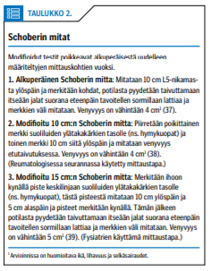 Kivun seurauksena lantio-lannerankarytmi voi häiriintyä, ja potilas koukistaa lonkkia lannerangan taivuttamisen sijaan ja tukeutuu käsiinsä. Löydös ei kerro diagnoosia vaan kuvaa kivun aiheuttamaa haittaa. Liikkuvuuden arvioinnissa käytetyt mitat, kuten Schoberin mitta tai modifioidut Schoberin mitat (taulukko «»2), voivat kertoa lannerangan jäykistymisestä esimerkiksi tulehduksellisen reumasairauden seurauksena. Tällöin lannerangan sivutaivutuksissa ja kierroissa liikelaajuus voi olla vähentynyt.