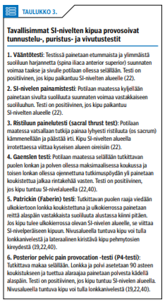 Päinmakuulla olevan potilaan nikamat ja selkä- sekä pakaralihasten jänteys ja kipualueet tunnustellaan. SI-nivelten tunnustelu-, puristus- ja vivutustesteissä pyritään saamaan esille niihin paikantuva kipu (21). Tavallisimmat testit on lueteltu taulukossa «»3. Näitä testejä ei kuitenkaan ole perusteellisesti analysoitu eikä standardoitu, eikä niiden käyttö kliinisessä työssä ole systemaattista.