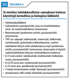 Metotreksaatista on niukasti näyttöä vain SI-nivelten alueen tulehduksissa, mutta niihin liittyvien monien oheissairauksien hoidossa siitä on todettu olevan hyötyä. Taulukossa «»4 on lueteltu kemiallisia ja biologisia lääkkeitä ja sairauksia, joissa niiden käyttö on mahdollista sairauden aktiivisuuden sitä edellyttäessä (3,34,35).