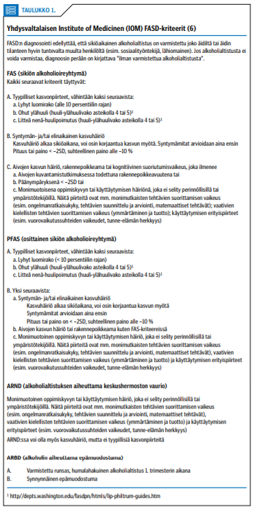 Päihteiden käytöstä suositellaan kysymään kaikilta äitiysneuvolassa asioivilta, sekä raskaana olevilta että heidän puolisoiltaan (18). Käytöstä kannattaa kysyä avoimin kysymyksin, joihin ei voi vastata kyllä tai ei. Ensin kannattaa kysyä käytöstä ennen raskautta ja sitten raskauden aikana. Strukturoituja kyselyitä voidaan käyttää haastattelun tukena. Suomessa laajimmin käytössä on AUDIT (Alcohol use disorders identification test) (19). Jos alkoholinkäyttöä on raskausaikana ollut, se on tärkeää myös kirjata potilasasiakirjoihin, sillä tieto on tarpeen lapsen mahdollisissa erotusdiagnostisissa selvittelyissä ja FASD:n diagnosoinnin edellytys (taulukko 1). Tietoa voi saada myös äidin tuntevalta luotettavalta henkilöltä, ja jälkikäteen tullutta informaatiota voidaan käyttää (4).