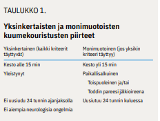 Kuumekouristukset luokitellaan yksinkertaisiin ja monimuotoisiin (taulukko «»1). Valtaosa, noin 80-90 % on yksinkertaisia. Yksinkertainen kohtaus on lyhyt, yleensä 1-2 minuutin mittainen mutta korkeintaan 15 minuuttia kestävä symmetrinen kouristuskohtaus lapsella, jolla ei ole aiempia neurologisia taustasairauksia tai kehitysviivettä. Monimuotoinen kouristus kestää yli 15 minuuttia, ja/tai se on epäsymmetrinen ja/tai uusiutuu 24 tunnin kuluessa.