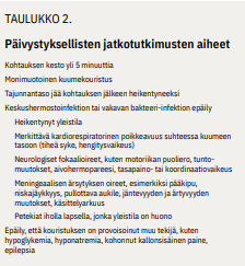 Kuumekouristuksen saanut lapsi kuuluu lähettää päivystyksellisesti lastenlääkärin arvioitavaksi erikoissairaanhoitoon ainakin, jos kuumekouristus on kestänyt yli 5 min tai se on ollut monimuotoinen, tajunnantaso jää kohtauksen jälkeen alentuneeksi, jos epäillään keskushermostoinfektiota tai sepsistä tai jos yleistila sitä muuten vaatii (taulukko «»2).