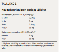 Kuumekouristusten ensiapuhoito toteutetaan kuten epileptisessä kohtauksessa. Yli 5 minuutin mittainen kohtaus vaatii ensiapulääkkeen. Ensisijainen lääke on suun limakalvoille annettava midatsolaami tai diatsepaami peräsuoleen (taulukko «»3). Pitkittyvä kuumekouristus hoidetaan kuten epileptinen kohtaus (6,10).