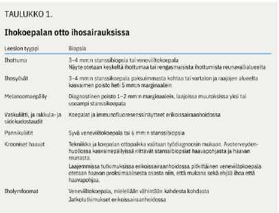 Mikäli ihomuutosta ei kyetä luokittelemaan hyvänlaatuiseksi, on koepala tarpeen esimerkiksi amelanoottisen melanooman poissulkemiseksi (7). Tietyissä ihosairauksissa koepalan otto ja diagnostiikka keskitetään erikoissairaanhoitoon (taulukko 1 «»1).