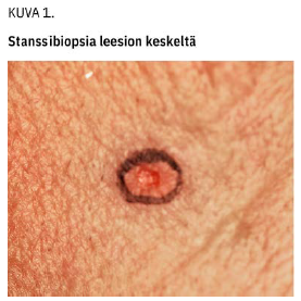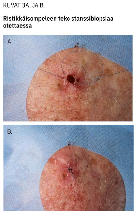 Koepala on hyvä nostaa neulalla ennen leikkaamista, jottei riko kudoksen arkkitehtuuria pinseteillä puristamalla. Mikäli stanssin koko on 4 mm tai isompi, on suositeltavaa käyttää ihoa suljettaessa ristikkäisommelta (kuva 3 «»4), joka tyrehdyttää hyvin myös verenvuodon.