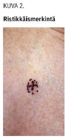 Ottokohta on tapana ympyröidä tussilla (kuva 1 «»2), mutta hiljattain on esitetty, että ristimerkintä olisi parempi ihomuutoksen rajojen hahmottamiseksi ja biopsian sulkemisen helpottamiseksi; silloin stanssin keskiosa tähdätään ristin keskelle (kuva 2 «»3) (9).