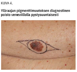 Pääperiaate melanoomaa epäiltäessä on, että epäilyttävä muutos poistetaan kokonaisuudessaan 1-2 mm:n marginaalein ottaen mukaan ihonalaista rasvaa. Ihokoepalan vastaus pyydetään kiireellisenä. Viilto tehdään vartalolla ja kasvoilla ihopoimujen suuntaan mutta raajoissa pitkittäissuuntaan imuteiden vaurioitumisen ehkäisemiseksi (20) (kuva 4 «»5).
