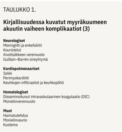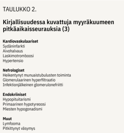 Taudin akuuttivaiheeseen liittyy joskus vaikeitakin komplikaatioita (taulukko 1 «»1) (3). Useimmat potilaat toipuvat taudista täysin. Jälki- seurauksia saattaa kuitenkin esiintyä (3). Kirjallisuudessa on kuvattu eniten kardiovaskulaarisia, nefrologisia, endokriinisiä ja potilaan yleisvointiin liittyviä seurauksia (taulukko 2 «»2).