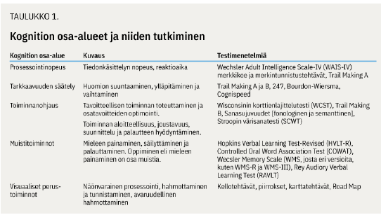 Tutkimustieto suomalaisten syöpäpotilaiden kognitiivisista ongelmista on vähäistä. Hus Syöpäkeskuksen koordinoimassa Euroopan komission BOUNCE (GA 777167) -hankkeessa tutkittiin rintasyövän lääkehoitoa saavia potilaita neuropsykologisin testein. Tulokset hoidon vaikutuksista kognitioon julkaistaan lähiaikoina. Syöpäpotilaille validoidun FACT-Cog-kyselyn kääntäminen suomeksi helpottaisi potilaiden kokemien haittojen kyselyä. Taulukkoon «»1 on kerätty kognition osa-alueiden sisältökuvauksia ja tutkimusmenetelmiä esimerkinomaisesti (34).