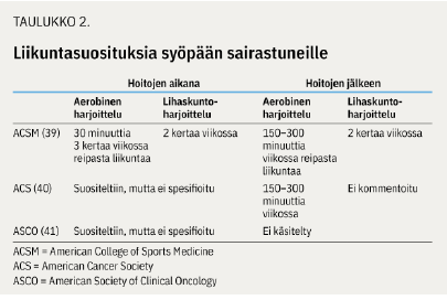Prospektiivisessa kohorttitutkimuksessa rintasyöpään sairastuneiden (n = 580) kemoterapian aikaista liikuntakäyttäytymistä ja kognitiota verrattiin terveisiin verrokkeihin (n = 363). Vain kolmasosa potilaista liikkui suositusten mukaan, eli ≥ 150 minuuttia viikossa vähintään kohtuullisen rasittavaa liikuntaa. Suositusten mukaan liikkuneiden naisten kognitio ei merkittävästi heikentynyt kemoterapian yhteydessä, toisin kuin liikunnallisesti passiivisten (35).
