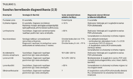 Diagnostiikka perustuu tietoon mahdollisesta puutiaisaltistuksesta, kliiniseen kuvaan sekä tarvittaessa seerumin vasta-ainemääritykseen eli serologiaan (5-7). Erythema migransin yhteydessä vasta-aineiden määrittämistä ei suositella, vaan potilas hoidetaan kliinisen kuvan perusteella. Muissa taudin ilmentymissä suositellaan vasta-ainemääritystä (taulukko 1 «»4).
