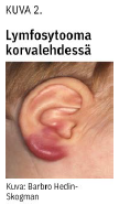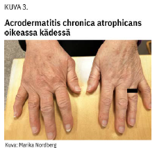 Lymfosytooma (kuva 2 «»2) on sinertävänpunainen kyhmy tyypillisesti korvalehdessä, nännin ympäristössä tai kivespussin seudussa, ja se on tavallisempi lapsilla. Acrodermatitis chronicaatrophicans (kuva 3 «»3) on harvinainen, yleensä raajojen ojentajapuolella ilmenevä myöhäisen borrelioosin ihoilmentymä. Alueella esiintyy usein ensin sinipunertavaa turvotusta, ja iho muuttuu vuosien kuluessa atrofiseksi ja ohueksi.
