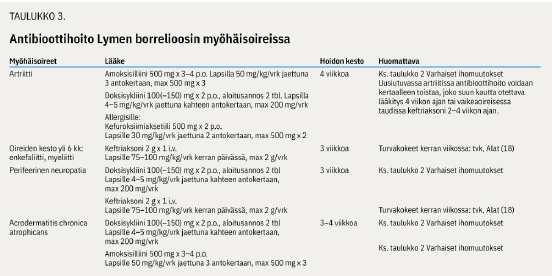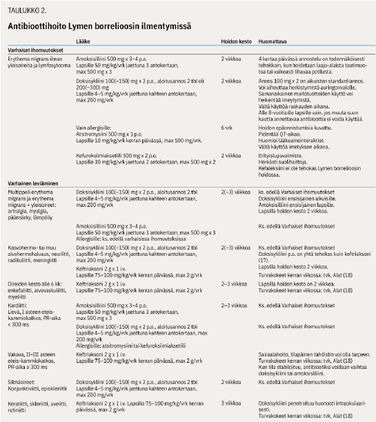 Kahden viikon hoitoaika on riittävä eryhema migransin, lymfosytooman sekä yleensä akuutin neuroborrelioosin yhteydessä (taulukko 2 «»5). Tuoreessa norjalaistutkimuksessa akuuttia neuroborrelioosia sairastaneet potilaat eivät hyötyneet yli kahden viikon antibioottihoidosta (12). Myöhäisilmentymissä, kuten artriitissa, suositellaan pidempiä hoitoaikoja (4,13).