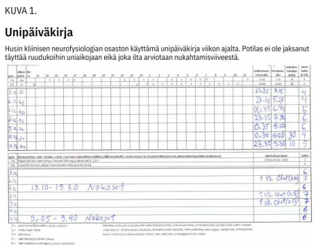 Unen määrää ja nukkumisrytmin säännöllisyyttä voi selvitellä uni(-valve)päiväkirjalla. Sen voi esimerkiksi ladata verkosta (6). Potilas merkitsee päiväkirjaan yö- ja päiväunet, oman arvion univiiveestä ja unen laadusta, tahattomat torkahtelut tai muut päiväväsymysoireet sekä kahvin tai muiden piristeiden, alkoholin ja tilapäisten lääkkeiden käytön (kuva «»1). Unipäiväkirja, jota potilas on täyttänyt hyvin vähintään kaksi viikkoa, antaa runsaasti tietoa hänen unestaan arjessa, ja sen avulla on helppo keskustella unen huollosta - esimerkiksi säännöllisestä päivärytmistä sekä liikunnan ja kofeiinin ajoittamisesta oikein.