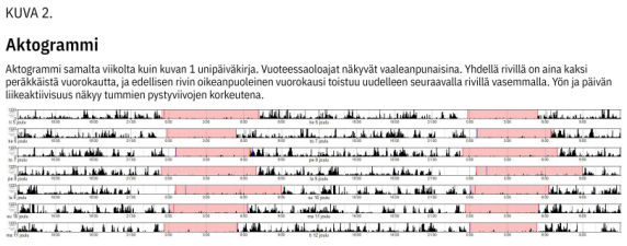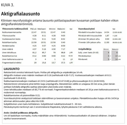 Aktigrafian ajalta unen määrän mediaani oli vain 5 h 16 min. Unen laadussa ei ollut poikkeavaa, ei myöskään vuorokausirytmissä. Unipolygrafiassa todettiin lievä obstruktiivinen uniapnea - apnea-hypopneaindeksi (AHI) oli 8,5/h. Unipolygrafiaan verrattuna aktigrafia yliarvioi unen määrää 30 min, lähinnä siksi, että potilas valvoi alkuyöstä, sillä rekisteröintilaitteet häiritsivät. Koska aktigrafia ei vertailussa aliarvioinut unen määrää, voidaan olettaa, että uni oli kaikkina paitsi yhtenä yönä liian lyhyt. Potilaalla ei ollut yleensä vaikeuksia nukahtaa tai pysyä unessa, eli hän ei kärsinyt unettomuudesta, joten hänelle annettiin ohjeeksi lisätä unen määrää 1,5-2 h vuorokaudessa ja toteuttaa uniapnean elintapahoitoa (16).