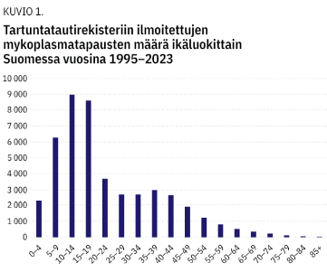 Mykoplasman aiheuttamia infektioita voi esiintyä kaikenikäisillä, mutta ilmaantuvuus on suurin lapsilla ja alle 50-vuotiailla aikuisilla (kuvio 1 «»1). Vaikeita oireita ja keuhkonulkoisia ilmentymiä nähdään erityisesti lapsilla, nuorilla aikuisilla ja raskaana olevilla (6,7). Suurimmalla osalla potilaista ei ole perussairauksia.