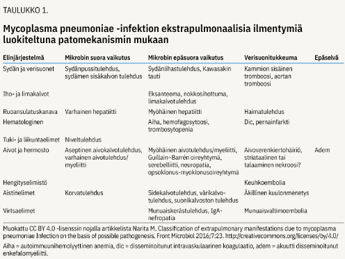Mycoplasma pneumoniae voi aiheuttaa monenlaisia ekstrapulmonaalisia oireita ja löydöksiä, tärkeimpinä iho- ja limakalvo- sekä neurologiset ilmentymät. Niiden oikea-aikainen diagno-sointi ja asianmukainen hoito voivat vähentää komplikaatioiden riskiä ja edistää toipumista.