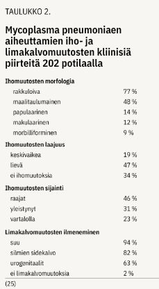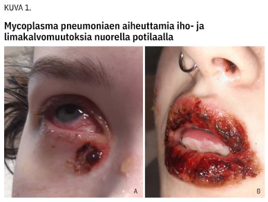 Mukokutaaniset eli iho- tai limakalvo-oireet ovat tavallisimpia mykoplasman ekstrapulmonaalisia ilmentymiä. Niitä tavataan noin 20 %:lla mykoplasman aiheuttamaa keuhkokuumetta sairastavista (14,23,24). Ihoreaktiot vaihtelevat lievästä eksanteemasta ja nokkosihottumasta kyhmyruusuun, kokardileesioihin ja rakkulointiin. Iho-oireisiin voi liittyä muutoksia suun, silmien ja joskus myös genitaalien limakalvoissa (kuva 1 a ja b «»3). Limakalvoreaktioita voi esiintyä ilman ihomuutoksia, erityisesti lapsilla (25).