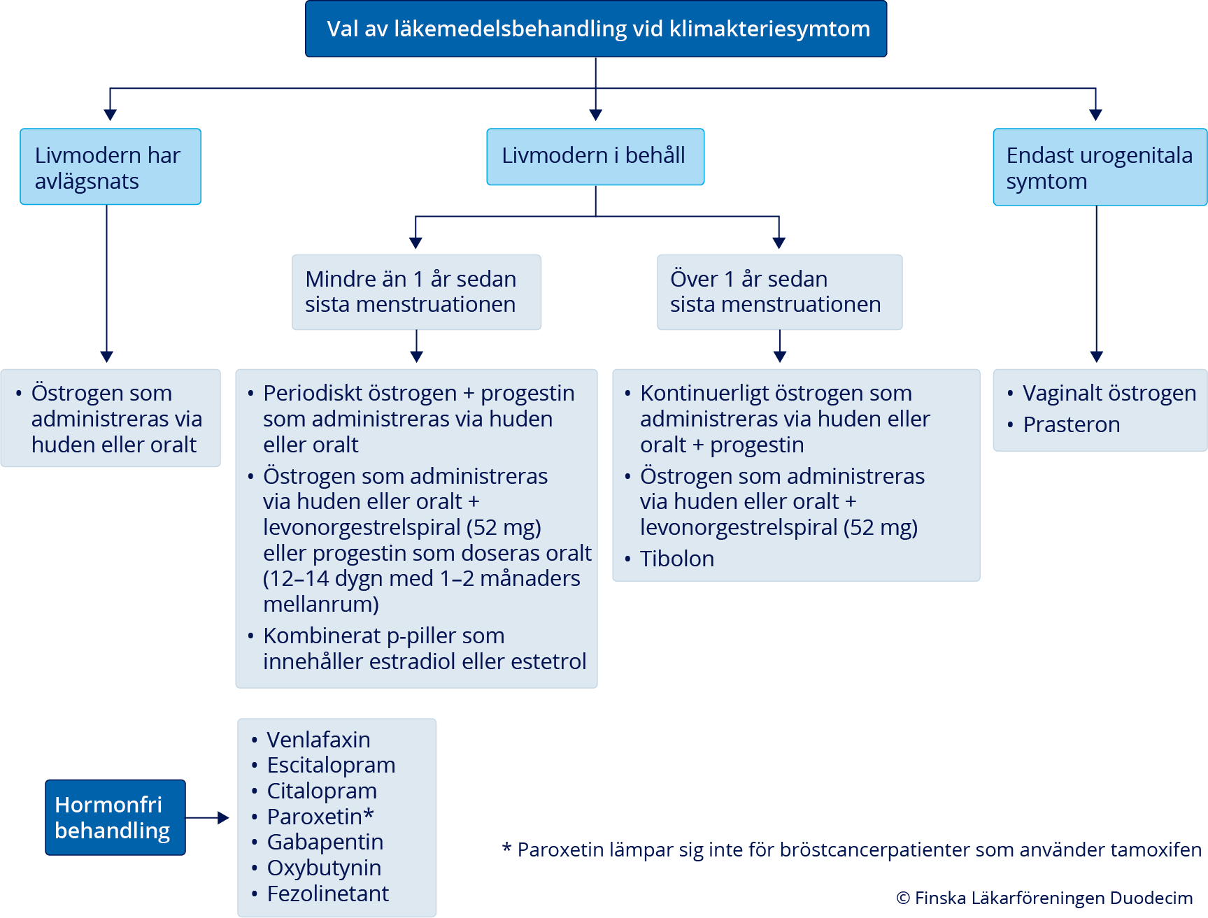| Om en patient med klimakteriesymtom inte vill ha systemisk hormonbehandling eller om sådan inte kan inledas inom primärvården på grund av kontraindikationer, kan symtomen behandlas med hormonfria läkemedelspreparat. «A16»14 |