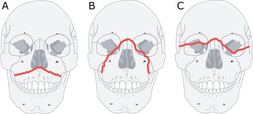 - Le Fort II: Maksillan pyramidaalinen murtuma. Murtumalinja kulkee poskionteloiden etuseinämien ja silmäkuoppien kautta nenän tyveen. Keskikasvot saattavat hetkua.