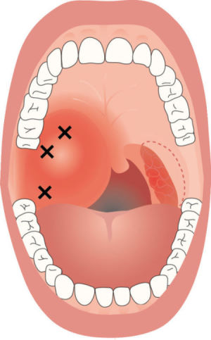 - Puudutetta infiltroidaan 1–2 ml etulakikaaren alle absessialueelle ensin aivan limakalvon alle ja sitten syvemmälle. Puudutuksen jälkeen pyritään samalla neulalla löytämään absessiontelon paikka aspiroimalla kolmesta kohdasta (video «Kurkkupaiseen avaus»1; kuva «»1).